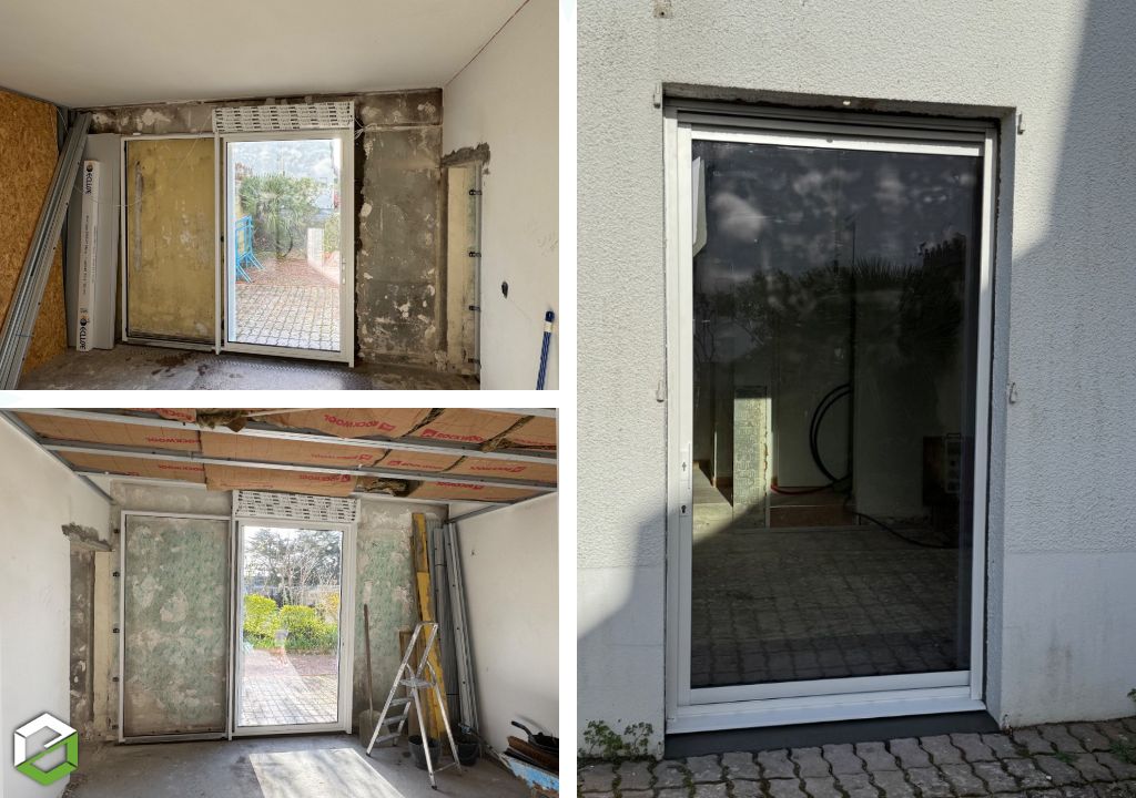 Les travaux incluent la modification de la maçonnerie pour adapter les dimensions de l’ouverture, ainsi que la pose d’une baie à galandage intégrée dans les murs existants.