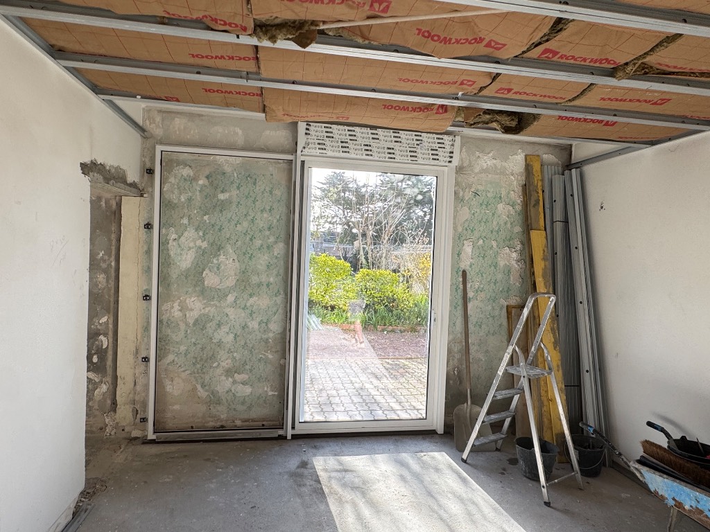 Les travaux incluent la modification de la maçonnerie pour adapter les dimensions de l’ouverture, ainsi que la pose d’une baie à galandage intégrée dans les murs existants. Ce système offrira une ouverture totale sans emprise des vantaux, favorisant un gain d’espace et un confort d’utilisation accru.